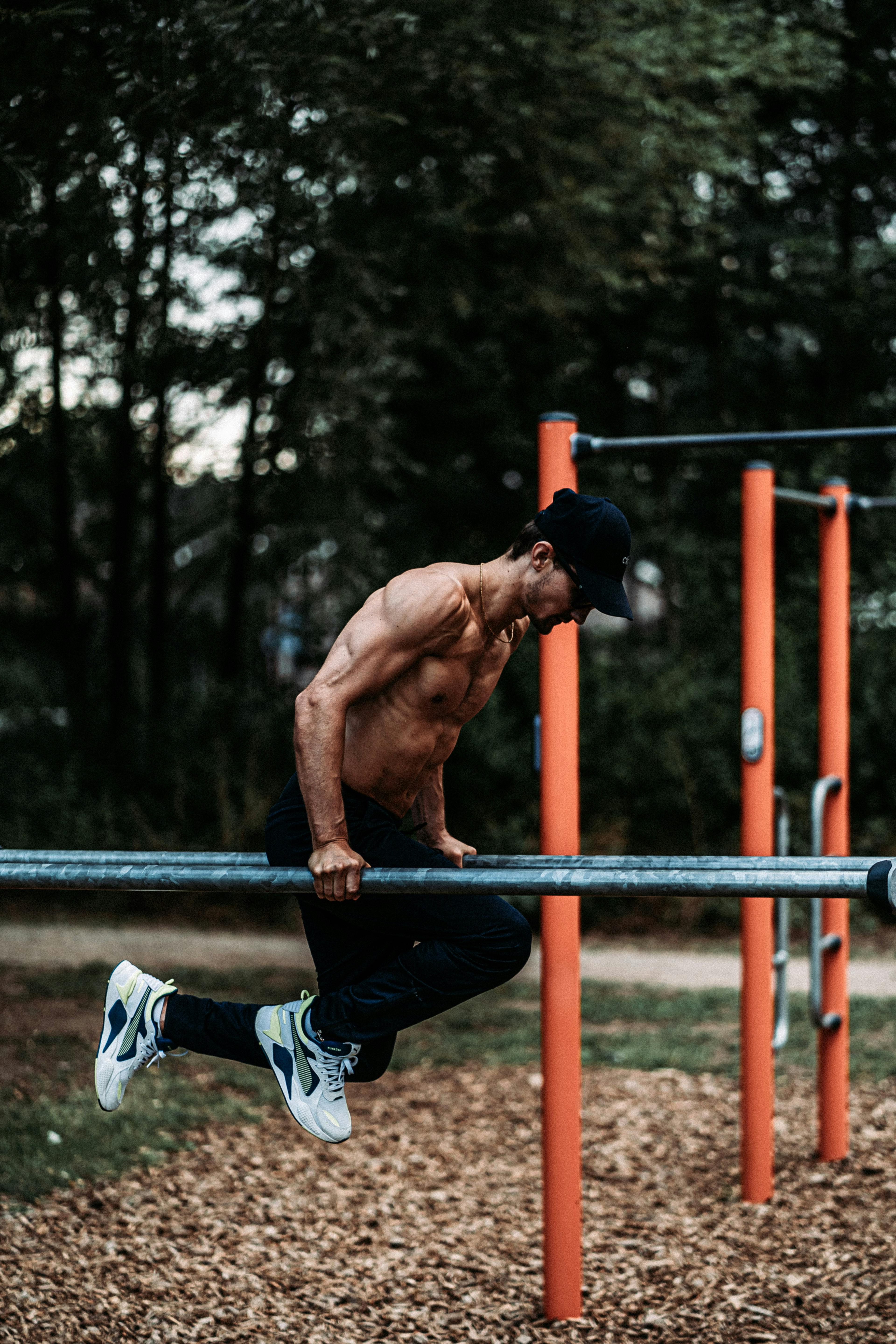 1. 준비: 딥스 바를 잡고 몸을 공중에 띄웁니다.